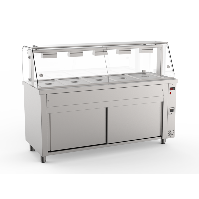 La présence d’une vitrine full avec verre trempé et portes coulissantes à l’arrière permet à la fois de protéger les préparations et de les rendre visibles. Cette configuration est particulièrement intéressante pour les ateliers qui souhaitent associer maintien chaud et présentation commerciale. Elle améliore aussi l’accès arrière pour le service, le réassort ou le nettoyage.