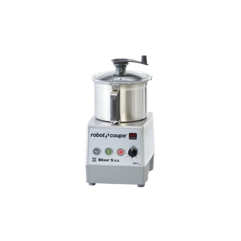 Robot Coupe Blixer® 5 V.V., cuve inox 5,9 L, moteur 1500 W, 230 V mono, vitesse variable 300–3500 tr/min, fonction Pulse, sécurité magnétique et thermique, livré avec couteau 2 lames dentées + couteau denté supplémentaire, 280 x 365 x 540 mm, 21,5 kg.