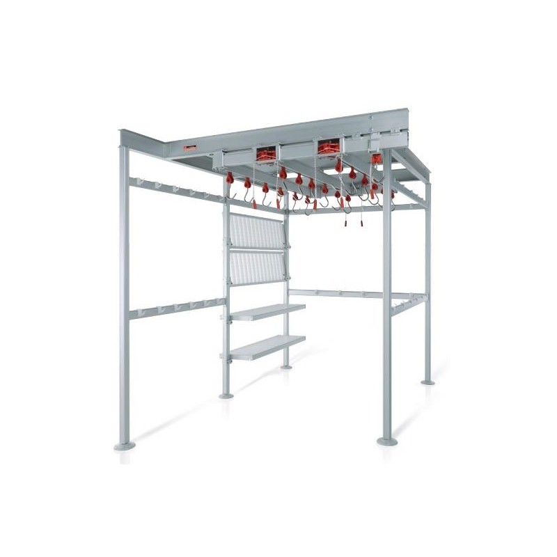 Pour améliorer l’ergonomie, il est possible d’ajouter un palan intégré permettant de monter/descendre la viande sans effort, ainsi qu’une balance intégrée pour peser directement sur la voie de rail. Idéal pour gagner du temps et fiabiliser le travail entre réception, stockage et préparation.